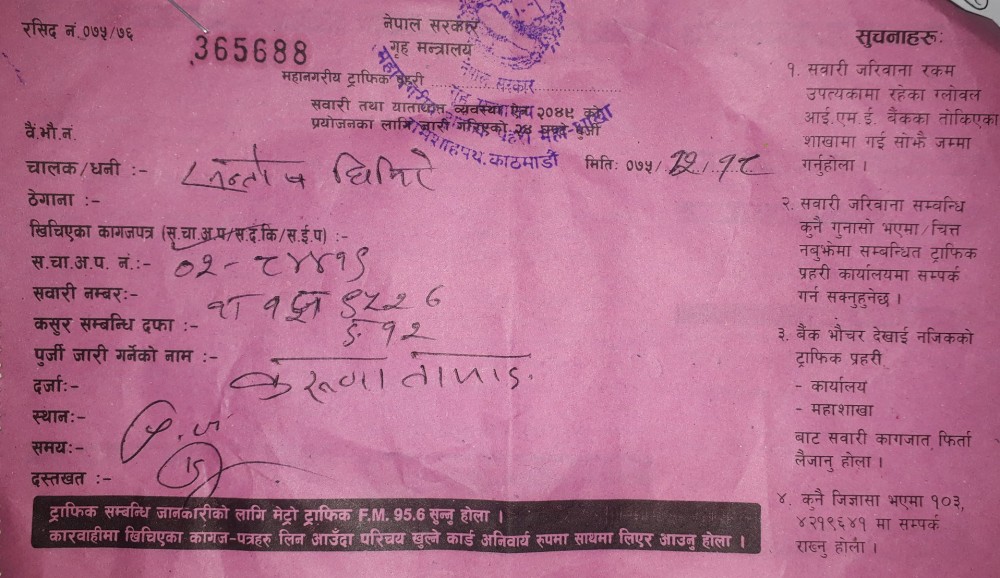 चालक घिमिरेलाई प्रहरीले ५ सय रुपैयाँ जरिवाना दस्तुर तिराएको छ।