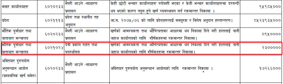 दैवी प्रकोप राहत तथा पुर्नस्थापनाका लागि छुटयाईएको २३ लाख रुपैयाँ बराबर रकम पानीजहाज कार्यालयलाई रकमान्तर गर्न अर्थ मन्त्रालयले गत फागुनमा अनुमति दिएको देखिन्छ।