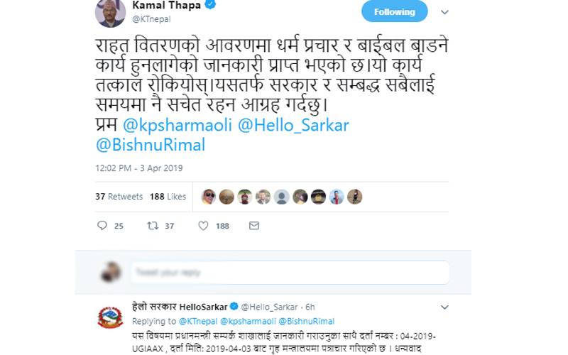 राष्ट्रिय प्रजातन्त पार्टीका नेता कमल थापाले पनि अप्रत्क्ष रूपमा एक ट्वीट गरेका छन्। ट्विटमा हेलो सरकार र प्रधानमन्त्रीलाई समेत मेन्सन गर्दै थापाले लेखेका छन्, ‘राहत वितरणको आवरणमा धर्म प्रचार र बाईबल बाँढ्ने कार्य हुन लागेको जानकारी प्राप्त भएको छ। यो कार्य तत्काल रोकियोस्। यसतर्फ सरकार र सम्बद्ध सबैलाई समयमा नै सचेत रहन आग्रह गर्दछु।’