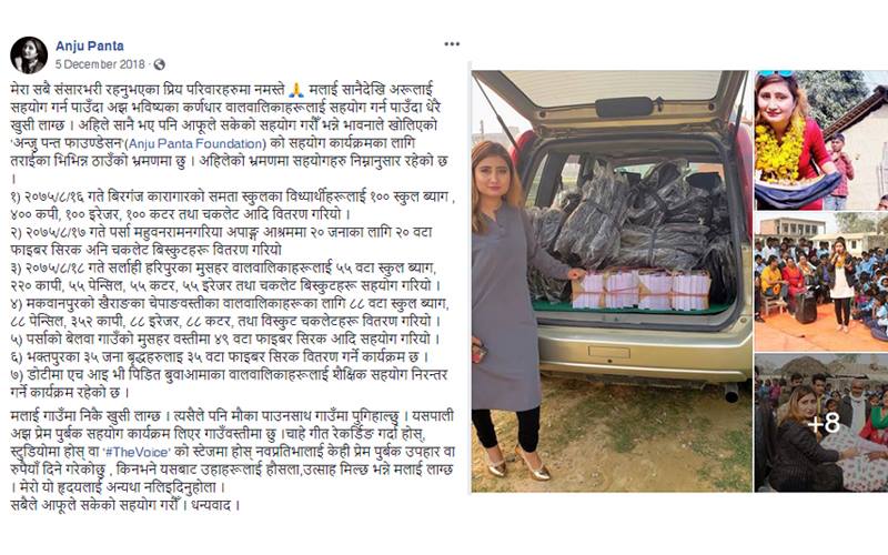 उक्त समय पन्तले आफ्नै नामको सामाजिक संस्था ‘अन्जु पन्त फाउन्डेसन’का तर्फबाट तराइका विभिन्न जिल्लामा रहेका बालबालिकालाई शैक्षिक सामग्री वितरण गरेको कुरा सार्वजनिक गरेकी थिइन्।