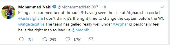 पूर्वकप्तान समेत रहेका नाबीले ट्विटरमार्फत अस्घरलाई विश्वकपअघि कप्तानबाट हटाउने अहिले सहि समय नभएको बताएका छन्। अस्घर अफगान टिमको नेतृत्व गर्ने सहि व्यक्ति भएको नाबीको भनाइ छ।