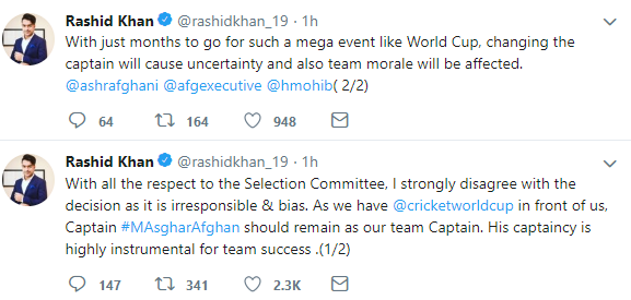 रासिद खानले पनि अस्घरलाई कप्तानबाट हटाउने निर्णयको विरोध गरेका छन्। उनले ट्विट गर्दै भनेका छन् – छनोट समितिको निर्णयलाई सम्मान गर्छु। तर निर्णयमा मेरो असहमती छ। निर्णय गैरजिम्मेवारीपूर्ण र पक्षपाती छ। हामी विश्वकप क्रिकेटको संघरमा छौं। अस्घर नै टिमको कप्तान हुनुपर्छ। उनको कप्तानीमा टिमले सफलता हात पार्छ। क्रिकेटको मेघा इभेन्ट्स विश्वकपअघि कप्तान परिवर्तन गर्दा अनिस्चितता र टिमको मनोबलमा असर पर्नेछ। ्