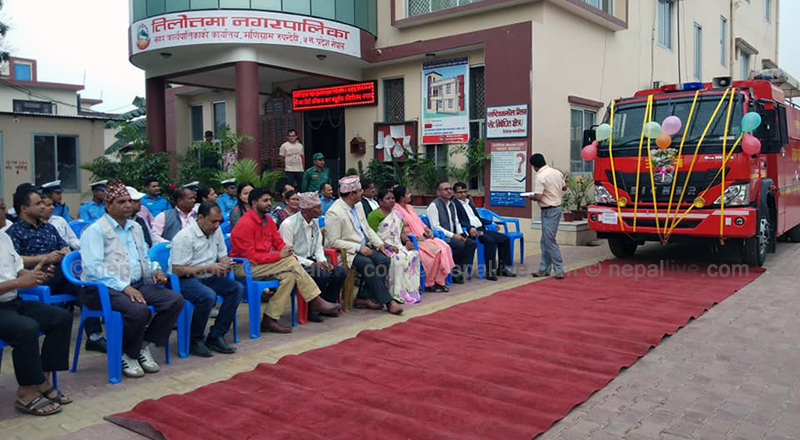 भैरहवा- रुपन्देहीको तिलोत्तमा नगरपालिकामा दमकल सेवा सुरु भएको छ। सेवाको शुक्रबार आयोजित एक कार्यक्रमबीच नगर प्रमुख वासुदेव घिमिरे र उप–प्रमुख जागेश्वरी चौधरीले शुभारम्भ गरे। ३ हजार ५ सय लिटर क्षमताको दमकलले ३५ मिटर टाढासम्म पानी फ्याँक्नसक्ने बताइएको छ।
