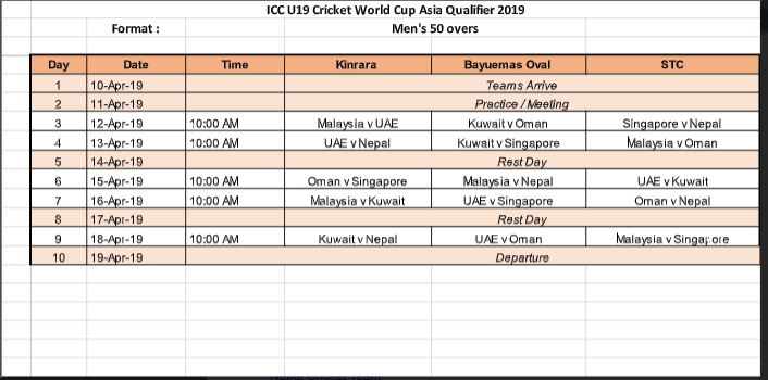 नेपालले मलेसियामा तीन दिन प्रशिक्षण गरेपछि नेपालले छनोटको पहिलो खेलमा चैत २९ गते सिंगापुर र दोस्रो खेल ३० गते युएईसँग खेल्नेछ। जहाँ नेपालसहित आयोजक मलेसिया, कुवेत, ओमान, सिंगापुर र युएईले भाग लिँदैछन्। शीर्ष एक टिम युवा विश्वकपमा छनोट हुनेछ।
