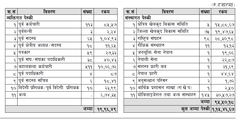 प्रतिवेदनअनुसार परिषद्मा १ अर्ब १५ करोड ४६ लाख ६७ लाख पेस्की बाँकी देखिएको छ। जसमा राष्ट्रिय संघमा सबैभन्दा पेस्की छ भने क्षेत्रीय खेलकुद विकास समिति दोस्रो नम्बर र बाहालवाला कर्मचारी तेस्रो नम्बरमा पेस्की लाने देखिएको छ। प्रतिवेदन अनुसार ५९ जना पत्रकारको नाममा २७ लाखको पेस्की देखिएको छ।
