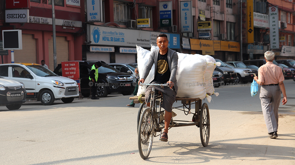 सामान बोकेर साइकल गुडाइरहेका रामेछापका विश्वमान डंगोल गोदाममा काम गर्छन्। उनी गोदामबाट दैनिक सामान ओसारपसार गरेर जीविकोपार्जन गर्छन्।