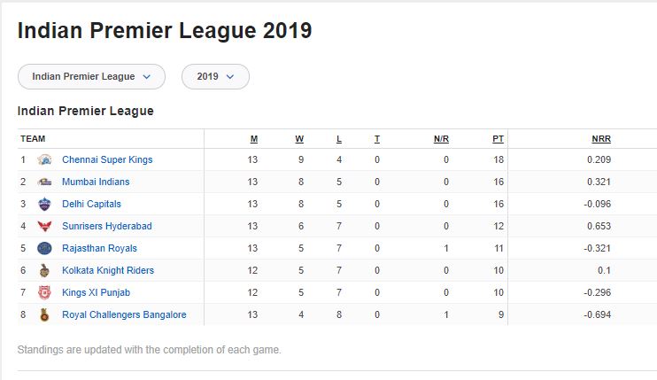 प्लेअफमा पुग्ने चौथो टिमका लागि भने चार टिमबीच प्रतिस्पर्धा हुनेछ। चौथो स्थानको सनराइजर्स हैदरावाद, पाँचौ स्थानको राजस्थान रोयल्स, छैटौं स्थानको कोलकाता नाइटराइडर्स र सातौं स्थानको किंग्स ११ पञ्जाव मध्ये एक टिम मात्र प्लेअफमा पुग्नेछ। अन्तिम स्थानको रोयल च्यालेन्जर्स बैंग्लोर भने बाहिरिसकेको छ।