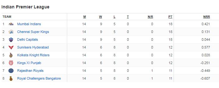 लिगमा मुम्बई शीर्ष स्थानमा रहन सफल भयो। मुम्बईले १४ खेलबाट १८ अंक जोड्यो। १८ अंक नै जोडेको चेन्नई सुपरकिंग्स दोस्रो स्थानमा रह्यो। रनरेटमा पछि परेको दिल्ली क्यापिटल्स १८ अंक जोडेर तेस्रो स्थानमा सीमित रह्यो।