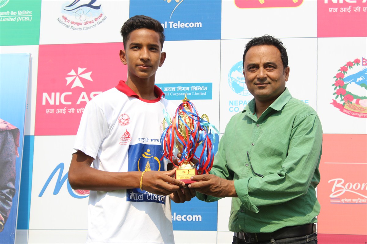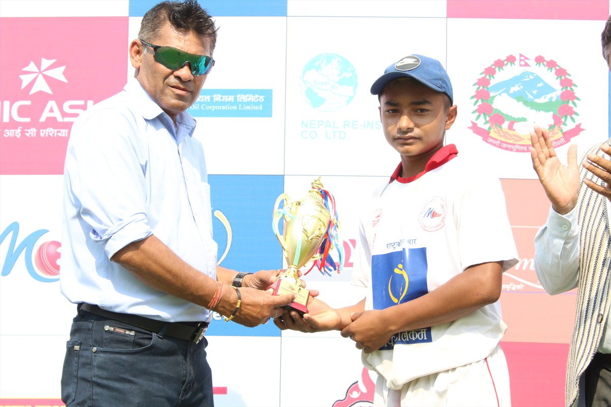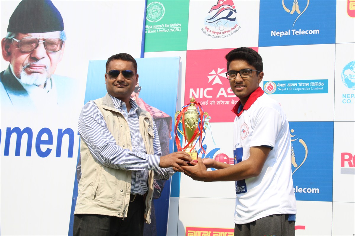 उत्कृष्ट ब्याट्सम्यान आसिस भट्टराईलाई ट्रफी प्रदान गर्दै राष्ट्रिय खेलकुद परिषद्का प्रेस सल्लाहकार रोहित दाहाल