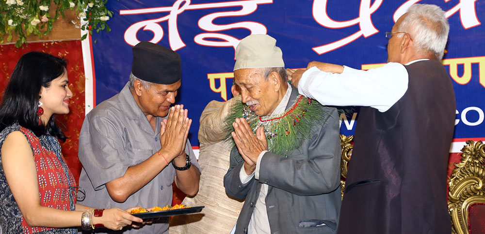 काठमाडाैं- उही पुरानै मयल रङको टोपी। दौरा सुरुवालमाथि कोट, सधैँ लगाउने जुत्ता उही। तर, अघिपछिभन्दा अली हँसिलो मुहार लिएर वाङ्मय शताब्दी पुरुष सत्यमोहन जोशी मञ्चमा आसिन थिए।