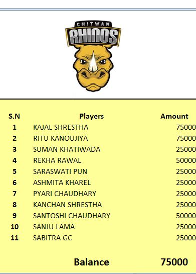 १. चितवन राइनोज – मिंग्मा डण्डु शेर्पा (स्वामित्व), इन्दु बर्मा (मार्की खेलाडी)