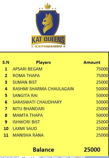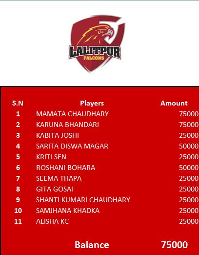 ४. ललितपुर फाल्कोन्स – श्रीजना जोशी (स्वामित्व), नेरी थापा (मार्की खेलाडी)