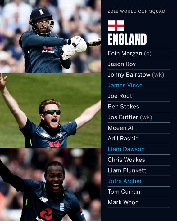 इंग्लिस टिम- इयान मोर्गान (कप्तान), मोइन अली, जोफ्रा आर्चर, जोनी बिस्ट्र, जोस बटलर (विकेटकिपर), टम कुरान, लियाम डाउसन, लियाम प्लुङ्केट, अदिल रसिद, जोए रुट, जासन रोए, बेन स्टोक्स, जेम्स भिन्स, क्रिस ओएक्स र मार्क उड
