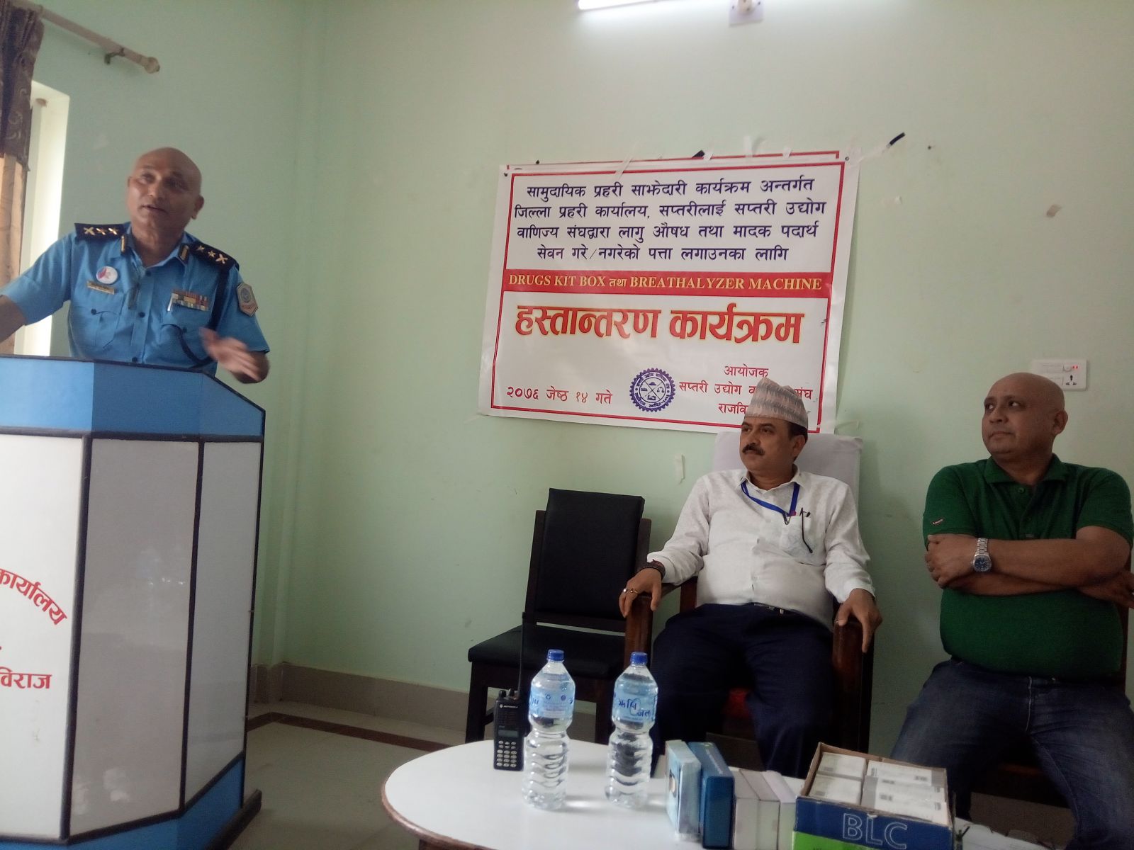 जिल्ला प्रहरी कार्यालय सप्तरीको अनुरोधमा सप्तरी उद्योग वाणिज्य संघले ‘समुदाय–प्रहरी साझेदारी कार्यक्रम’ अन्तर्गत ५० थान ड्रग्स किट बक्स र ५ थान ब्रेथलाइजर (मादक पदार्थ सेवन गरे/नगरेको चेक गर्ने) मेसिन उपलब्ध गराएको उनले बताए।