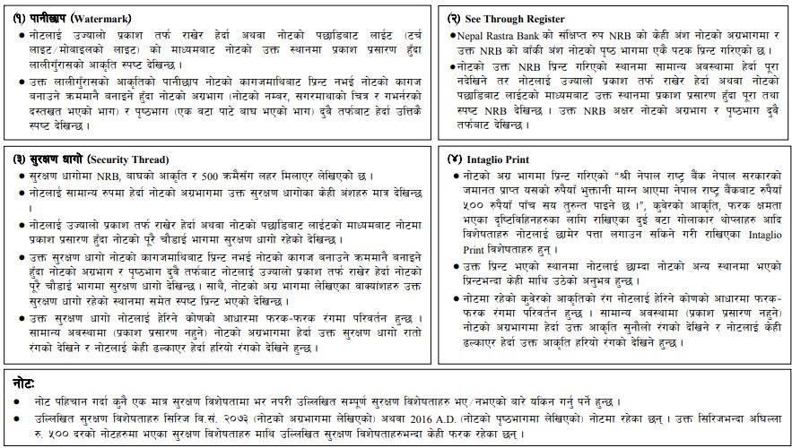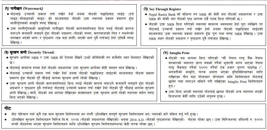 नेपाल राष्ट्र बैंकले नक्कली र सक्कली नोटमा रहेका सुरक्षण सम्बन्धी विशेषताहरु थाहा पाउने तरिकाका बारेमा यसरी सिकाएको छ।