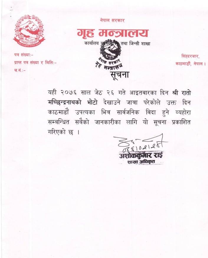 आइतबार रातो मच्छिन्द्रनाथको भोटो देखाउने जात्रा परेकाले सरकारले त्यस दिन बिदा दिने निर्णय गरेको हो।