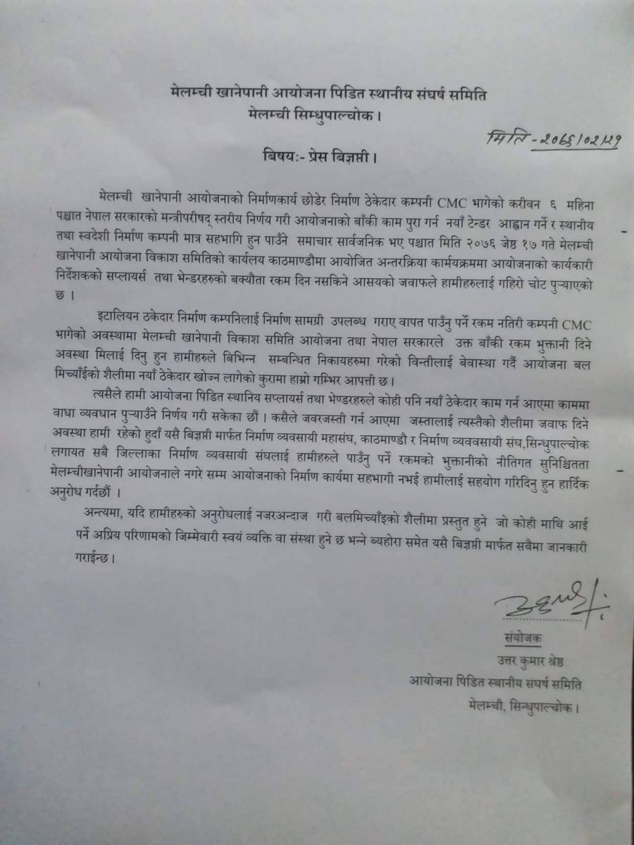 नेपाल सरकारको मन्त्रिपरिषद्स्तरीय निर्णय गरी आयोजनाको बाँकी काम पूरा गर्न नयाँ बेलपत्र आह्वान गर्ने र स्थानीय तथा स्वदेशी निर्माण कम्पनी मात्र सहभागी हुन पाउने सूचनामा उल्लेख छ। मेलम्ची खानेपानी विकास समितिको कार्यालयमा भएको अन्तर्क्रिया कार्यक्रममा आयोजनाका कार्यकारी निर्देशक सूर्यराज कँडेलले स्थानीय सप्लायर्स तथा भेन्डर्सहरूको बक्यौता रकम दिन नसकिने आशयको जवाफ दिएकोप्रति आफूहरुलाई गहिरो चोट पुगेको विज्ञप्तिमा उल्लेख छ ।