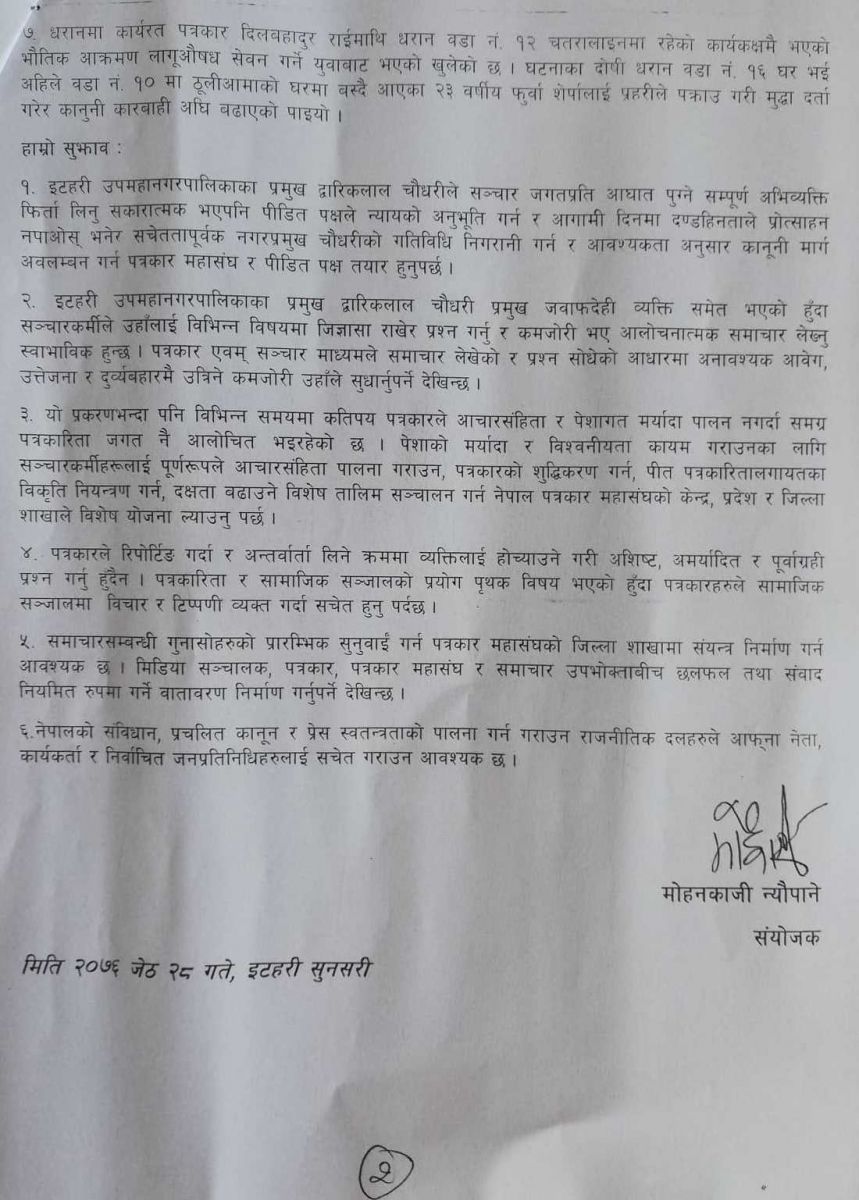 इटहरीमा भएको पत्रकार र मेयरबीचको घटनालाई लिएर टोलीले केही सुझाब दिएको छ। मेयर चौधरीले गल्ती स्वीकार गरे पनि पीडित पक्षले अनुभुति हुने गरी मेयर चौधरीले आगामी गतिविधि सच्याउनु पर्ने देखिएको छ।