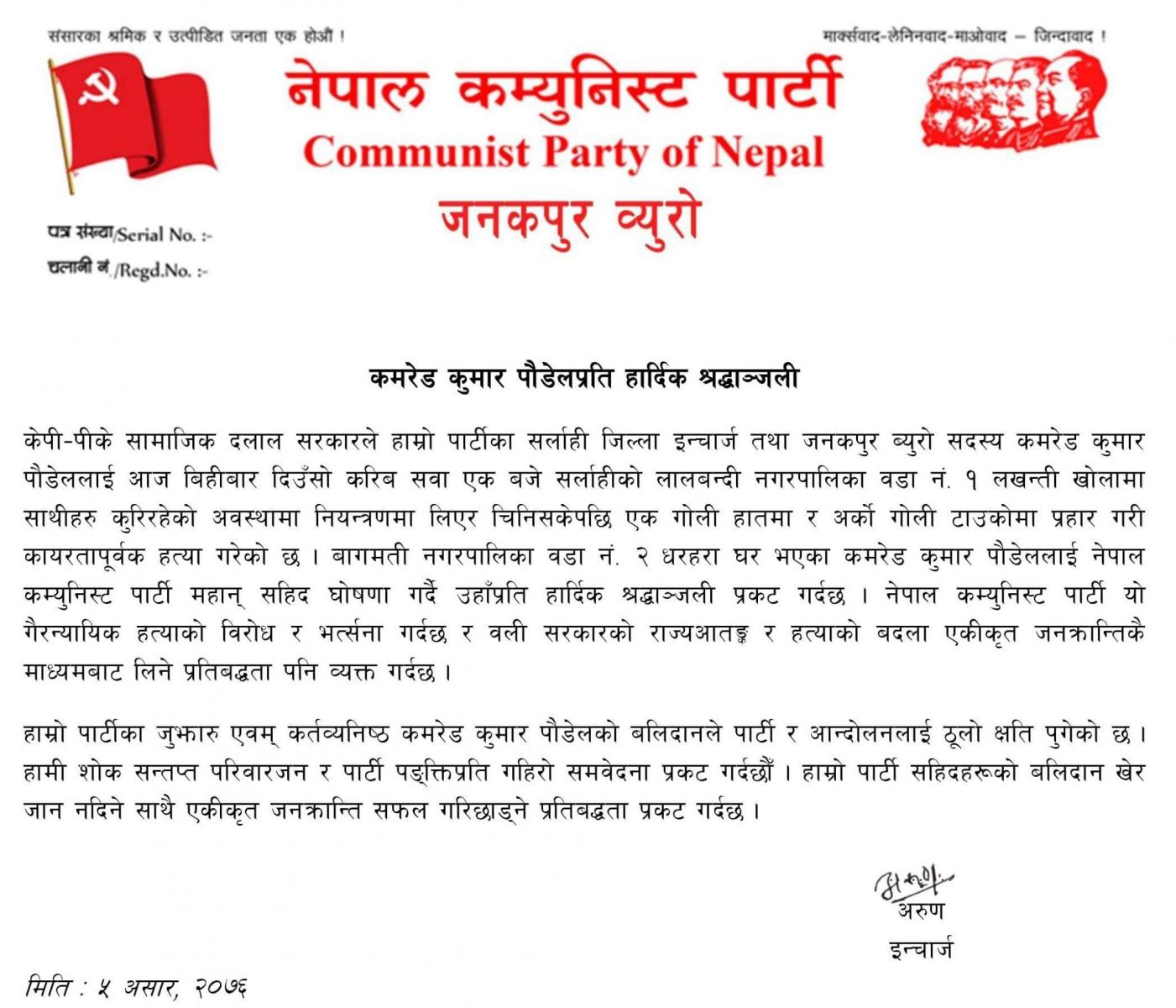 विप्लव नेतृत्वको नेकपाका जनकपर ब्युरो इन्चार्ज अरुणद्वारा हस्ताक्षर गरिएको विज्ञप्तिमा भनिएको छ, 'केपी-पिके सामाजिक दलाल सरकारले… कायरतापूर्वक हत्या गरेको छ। नेपाल कम्युनिस्ट पार्टी गैरन्यायिक हत्याको विरोध र भर्त्सना गर्दछ।'